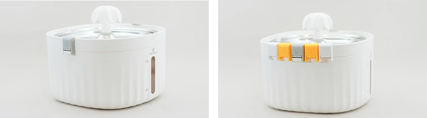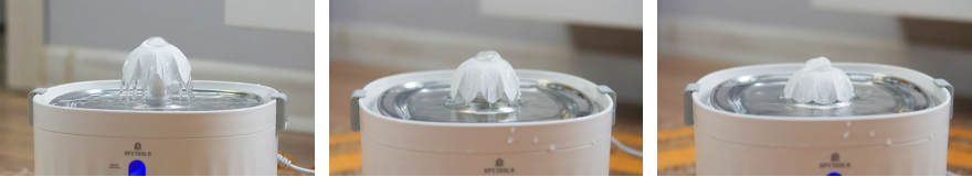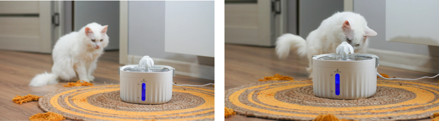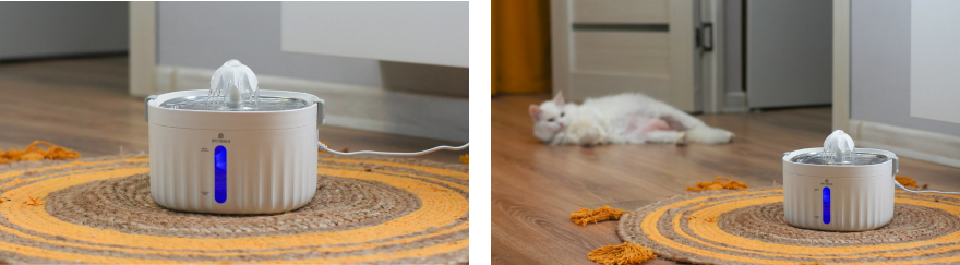 Before using the fountain for the first time, it is necessary to fill it with water to a certain level. If there is not enough water in the fountain, the pump will not start and the blue backlight will turn red, indicating that more water is needed.