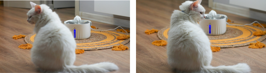 If the problem with the feed supply was solved by adjusting the portion size, the problem of stagnant water remained unresolved. For this reason, it was decided to try the APETDOLA FP10 water fountain, which would eliminate this problem and also make some difference to the cat.