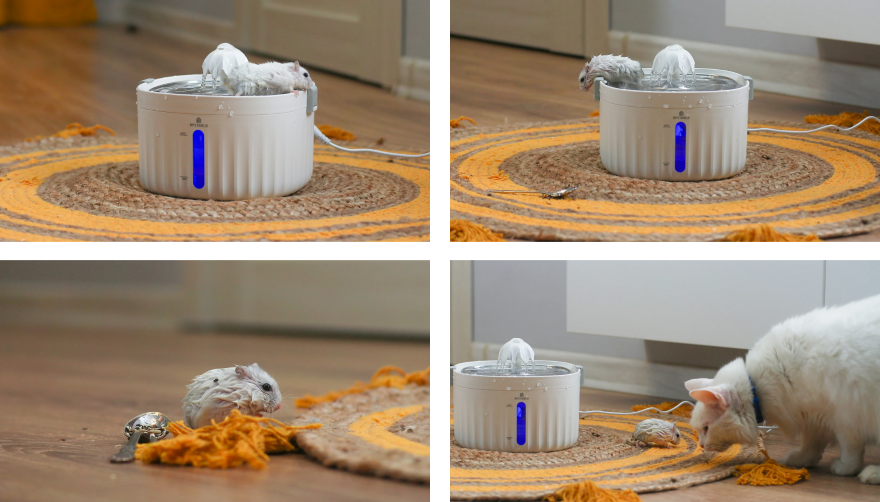 We additionally attempted to use the water fountain as an attraction by placing our jongleur hamster named Sneginka (she's a girl) in the bowl. The hamster didn't appreciate the gesture and quickly left the activity. But she got washed anyway!