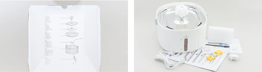 To ensure that the fountain doesn't slip on tiles, laminate, or other surfaces, rubber inserts have been included. Additionally, there is a sticker in the center that provides technical information.