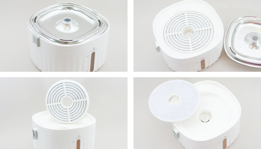 If you look at the top plate, you can see 4 overflow plates with a spout in the middle, into which the fountain funnel is inserted. The filter element under the plate, which looks like charcoal with pebbles inside, is also interesting. And it's good to hear that a spare filter for this water fountain can be purchased from APETDOLA store.